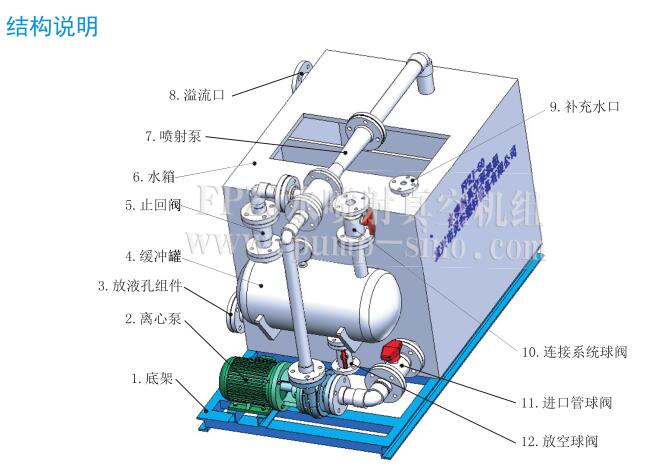 FPZJ九游(中国)水喷射真空机组以离心泵为工作动力,通过喷射泵使速度能转换成压力能,在喷射泵吸口处形成真空,可抽吸干空气,可凝性气体、水蒸气、水,由于该产品全部采用改性增强聚丙烯塑料,特别对酸碱等腐蚀性气体有很强抗腐性能,该产品广泛应用于制药、纺织、食品、环保、化工等行业上的真空吸收、真空结晶、真空浓缩、真空干燥、真空输送等工艺。