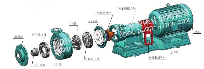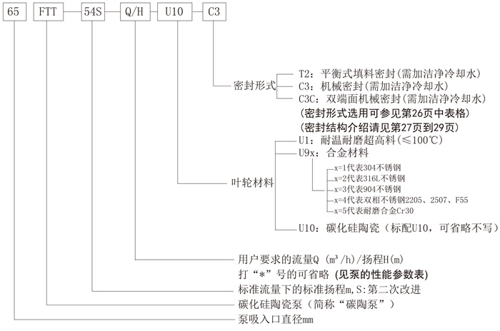 一、概述 FTT九游(中国)碳陶泵是一种单级单吸卧式离心 泵,泵体、泵盖、进口管、叶轮等过流部件采用耐磨、耐腐性能优良的碳化硅陶瓷制作,外部用铸铁铠装保护,解决了碳化硅零件容易开裂的问题,使碳化硅泵能在含固体颗粒腐蚀性液体的恶劣工况条件下长期安全可靠的运行。 该泵具有耐腐蚀、耐磨损、维修方便、使用可靠、寿命长经济性好等特点,适用于输送除氢氟酸和浓碱液以外的含有大量固体颗粒的各种腐蚀性介质。 碳化硅陶瓷泵耐磨性能优良,是普通不锈钢金属泵的8-10倍,综合其使用寿命,是一种性价比超高的渣浆泵。 该泵获发明专利(专利号:ZL 2013 1 0040479.7) 二、用途 该泵广泛应用于有色冶炼、黑色冶炼、化工、钛白粉、稀土等介质中含有大量固体颗粒行业。使用范围可按防爆区域和和非防爆区域选用,凡在防爆区域内使用需配置防爆型电机。 该泵适用温度为-50°C-120°C,温差骤变小于50°C。 三、型号说明